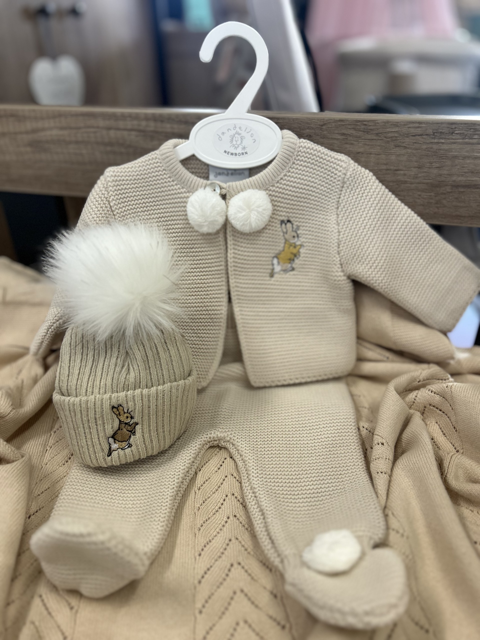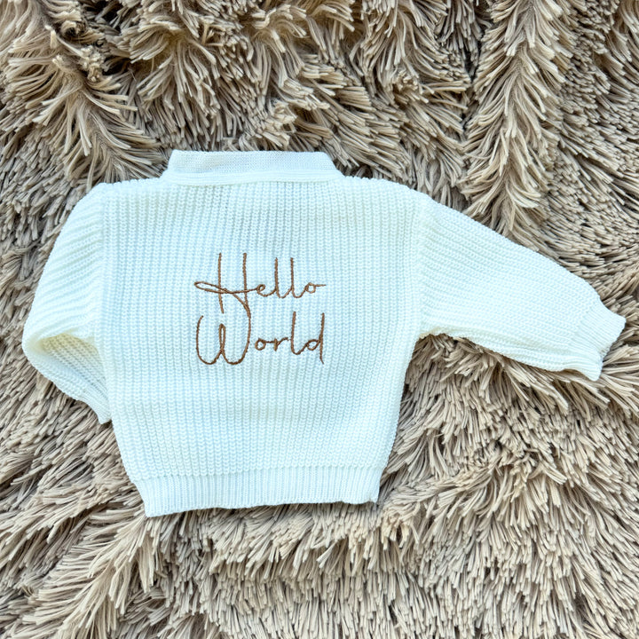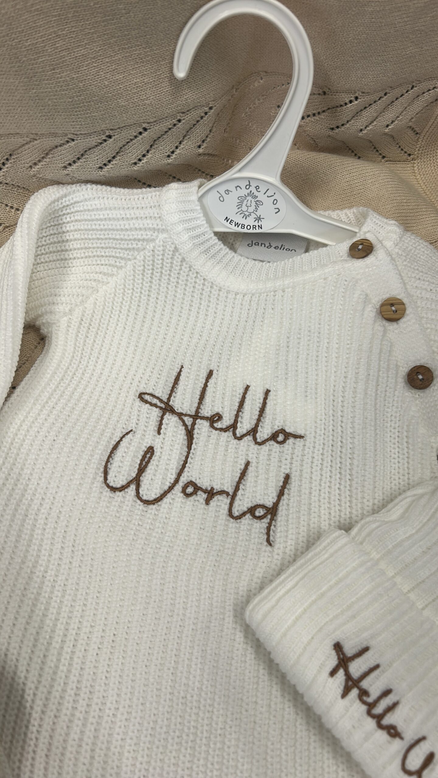 A gorgeous new arrival from Dandelion. A white long sleeved knitted fisherman style romper with wooden button fastening and ‘Hello World’ embroidery detailing. The matching hat completes this adorable first outfit set!