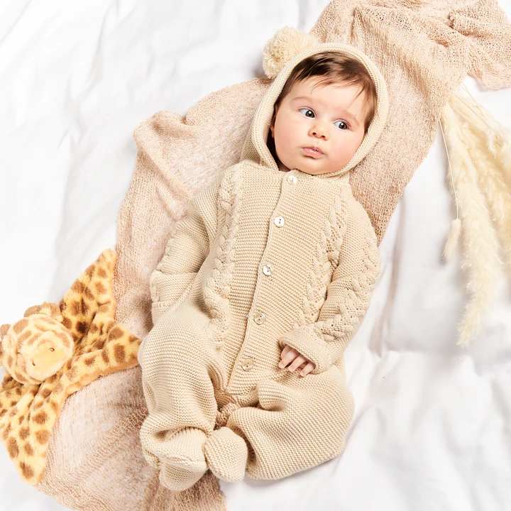 A gorgeous new colour way for a popular style by Dandelion Clothing. A gorgeous knitted pramsuit with cable knit design and cute pom pom hood.