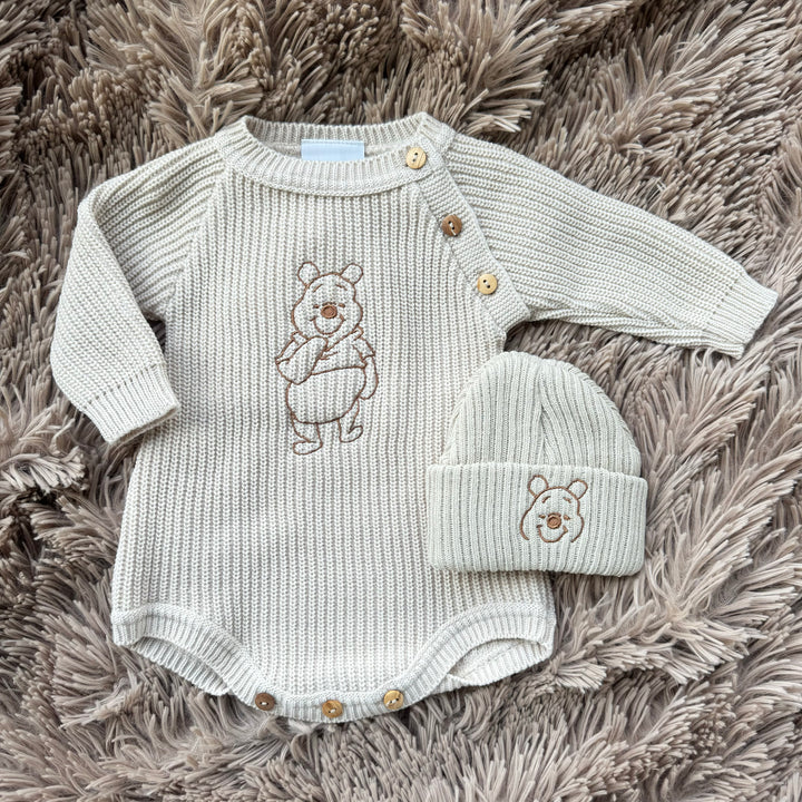 An adorable new arrival for their first wardrobe! A white knitted cardigan with sweet taupe ‘Hello World’ detailing on the back.